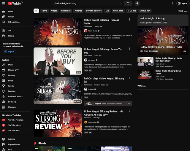 First, let's check out YouTube and Twitch - Hollow Knight Silksong full and quick reviews, play throughs and live streams - huge quantities of instant content for you to consume...5.6 million people watched the release trailer alone!