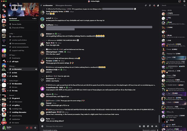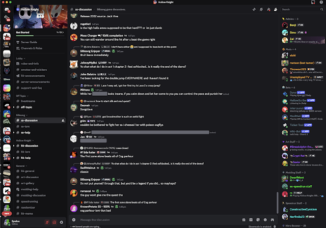 As I screenshotted the discord channel below, note at the top of the right pane that there are over 55,000 people online at lunch time on a Tuesday in the official Hollow Knight Discord channel - just for this one game!