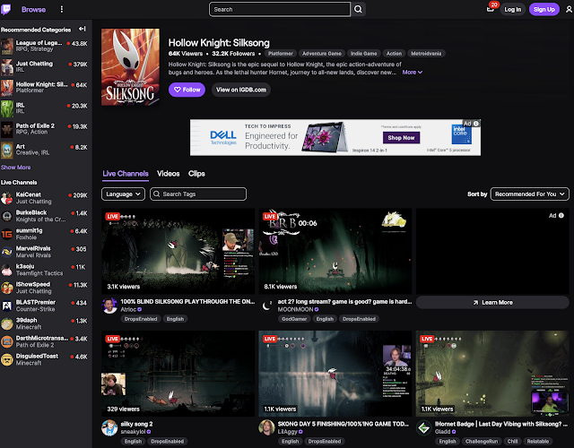 You can ask questions in chat in real time too, to make the decision to buy it or not even easier - over 8,000 people are watching just one Twitch streamer in real time playing Hollow Knight Silksong during my lunch time Adelaide time (in the screenshot below):