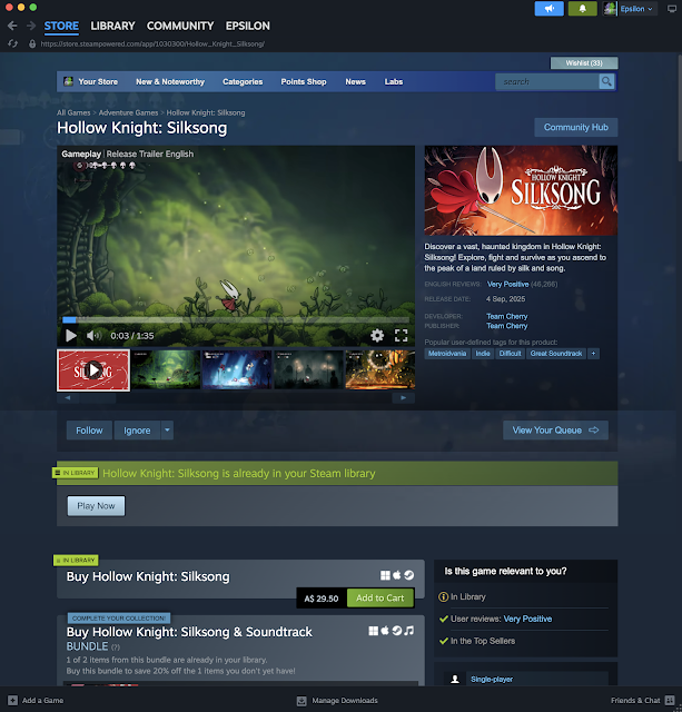 Take, for example, the latest release Hollow Knight: Silksong game on console (Switch 1/2) and Steam (PC/Mac/Linux) this past week.