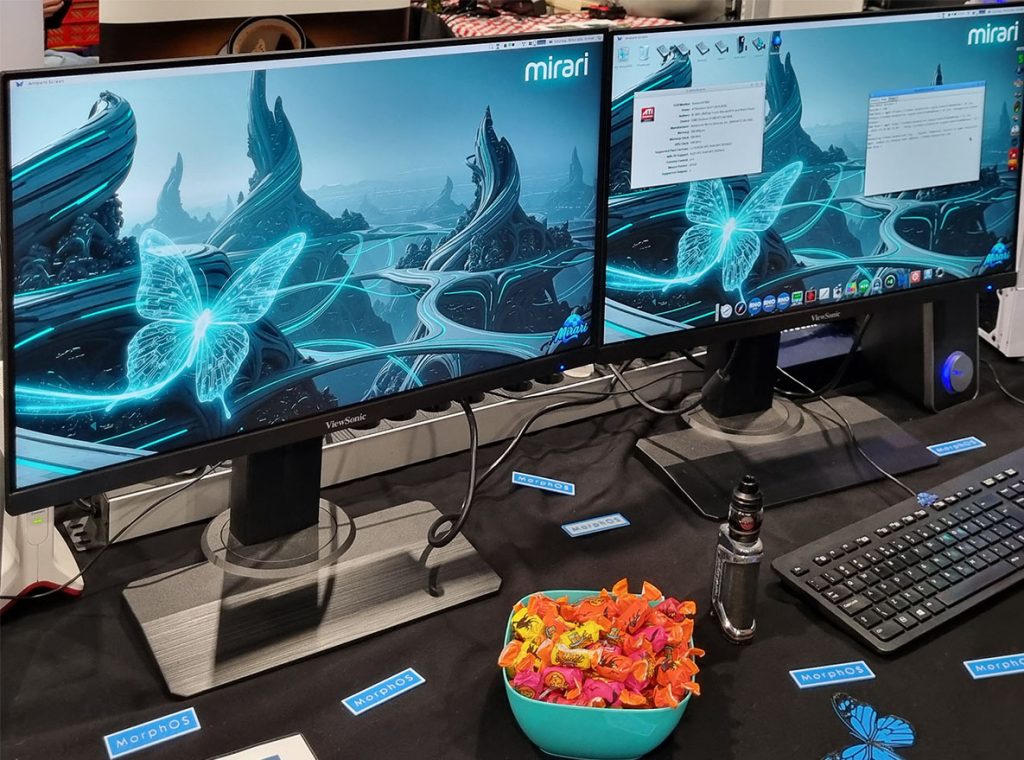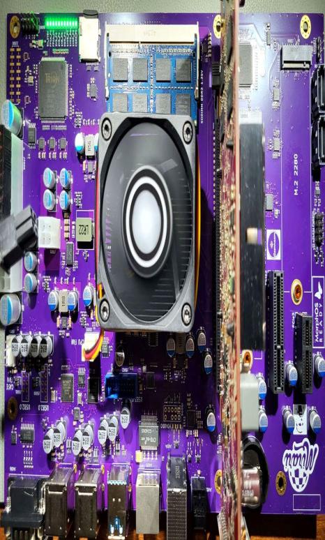 I brought a Mirari board back from Germany after the Amiga 40 show. Hand-carried it myself. It’s now set up here and running both MorphOS and Void PPC Linux. The board’s colour is purple, not an accident. Red plus blue.