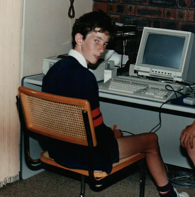 Here is me on the family Amiga 500 after school in Perth, back in 1989. No hard disk, everything was on floppy disk.