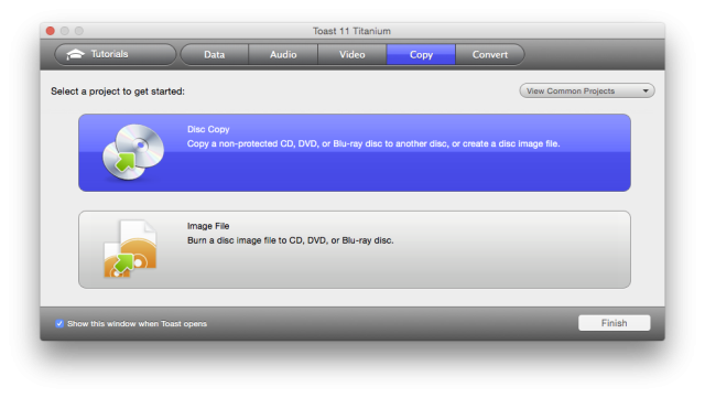 Next we need to create an image (iso) of our AmigaOS4.1 Final Edition Classic CD, to be able to mount it in FS-UAE. I used Toast 11 for this, but you can use whatever your favourite image creation program is on Mac OS X. Select the Disc Copy function.