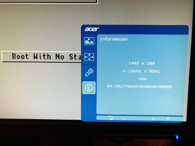 On power on I held down both mouse buttons to get the early boot screen, which appeared on the Acer screen straight away! I then brought up the screen mode info screen to confirm it is indeed running at 15khz!!