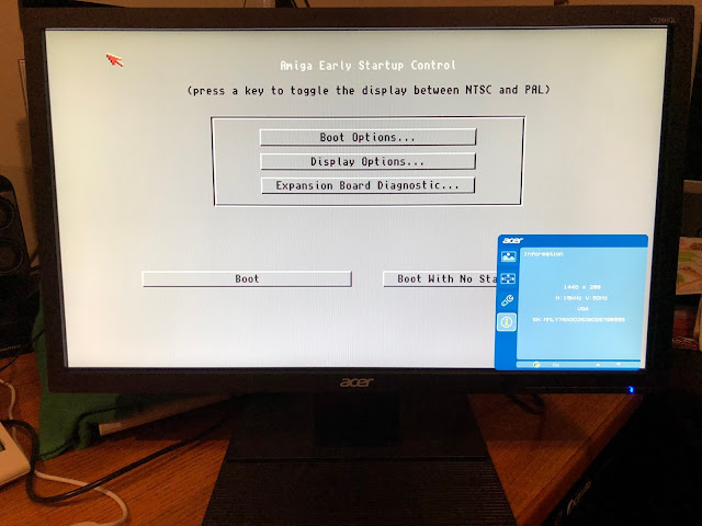 Next up I hooked up the Amiga 1000, one of the systems I wanted to get this screen for. Unlike the other Amigas I don't have a Indivision ECS installed or a scandoubler connected to it. It needs this screen, and so I was very excited to try it out. As you can see the Kickstart screen came up fine on the Acer: