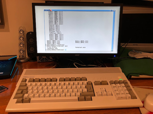 Since I happened to have the Amiga 1200 out at the time, I decided to try it on that system first. Technically I don't need it since I have an Indivision AGA installed in it already, but hey, why not check it anyway! Here it is connected to the A1200: